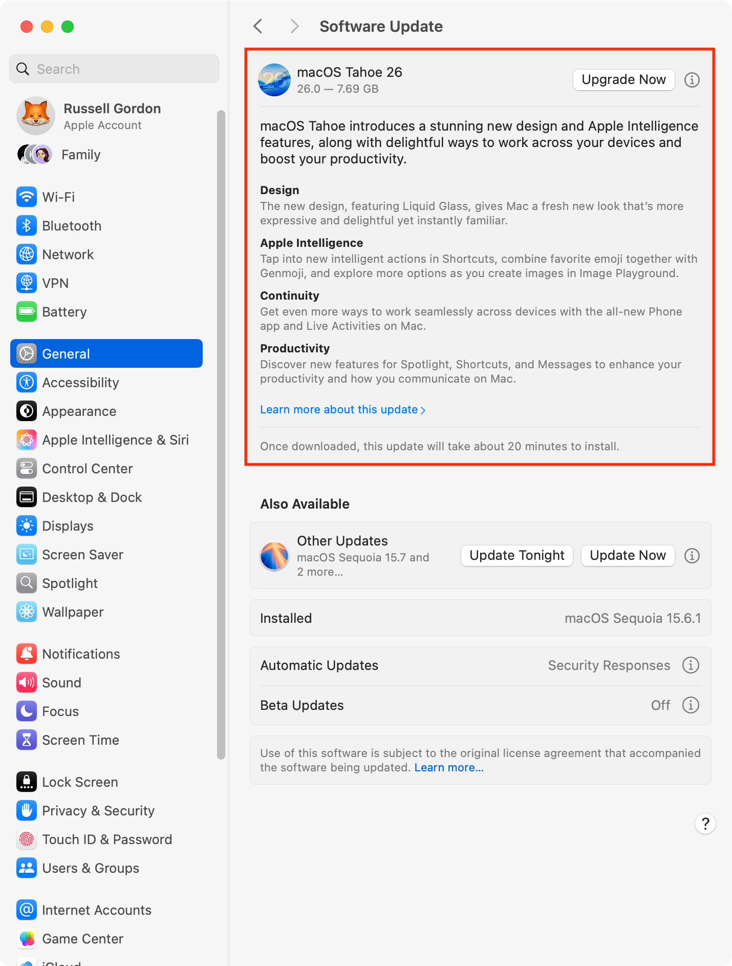 macOS Tahoe 15.0.1 may be available ā if it is, upgrade to that version of the OS, please.