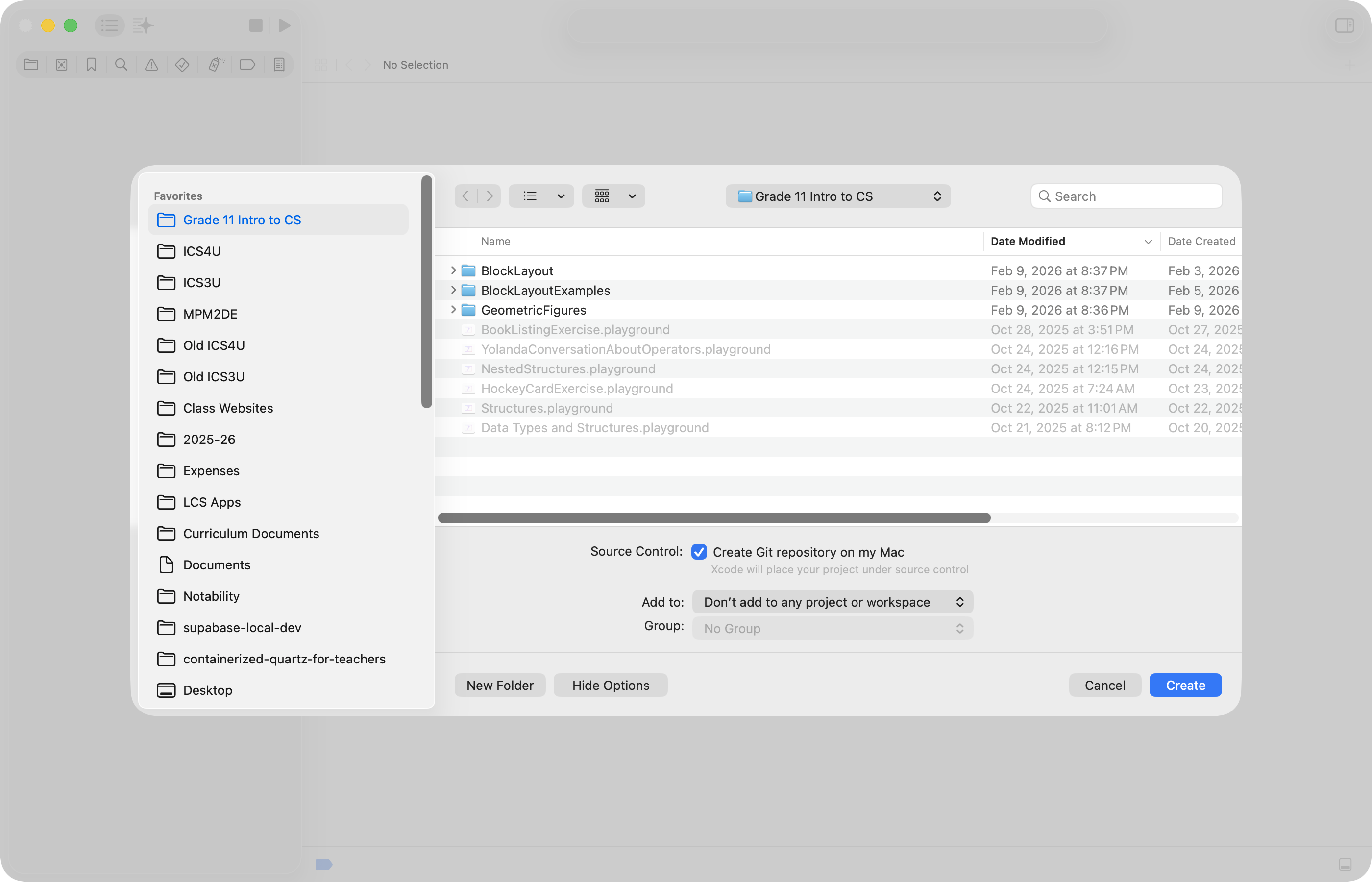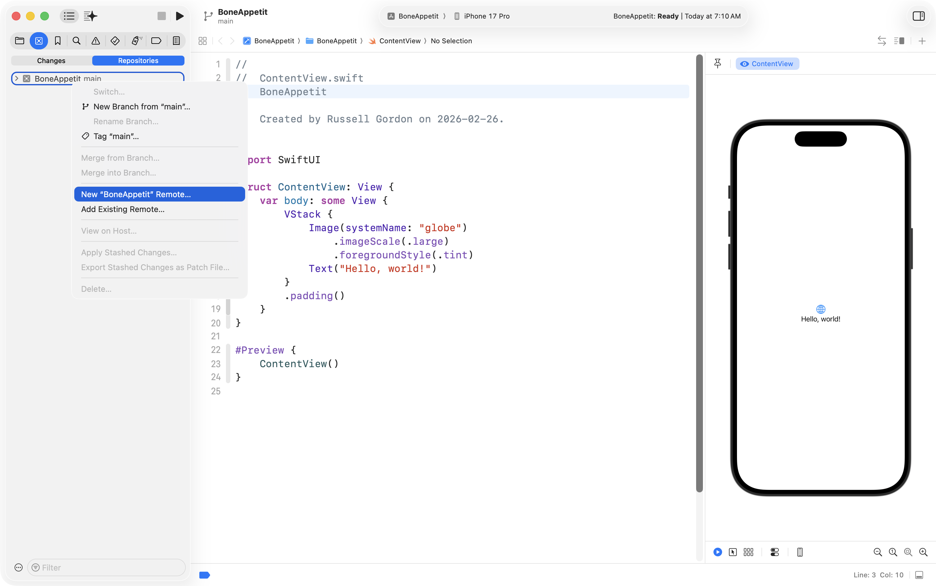 First, Mr. Gordon created a new project named BoneAppetit to keep track of his work, saving it his Grade 11 Intro to CS folder on his computer, making certain that the option to create a local repository for source control was enabled: