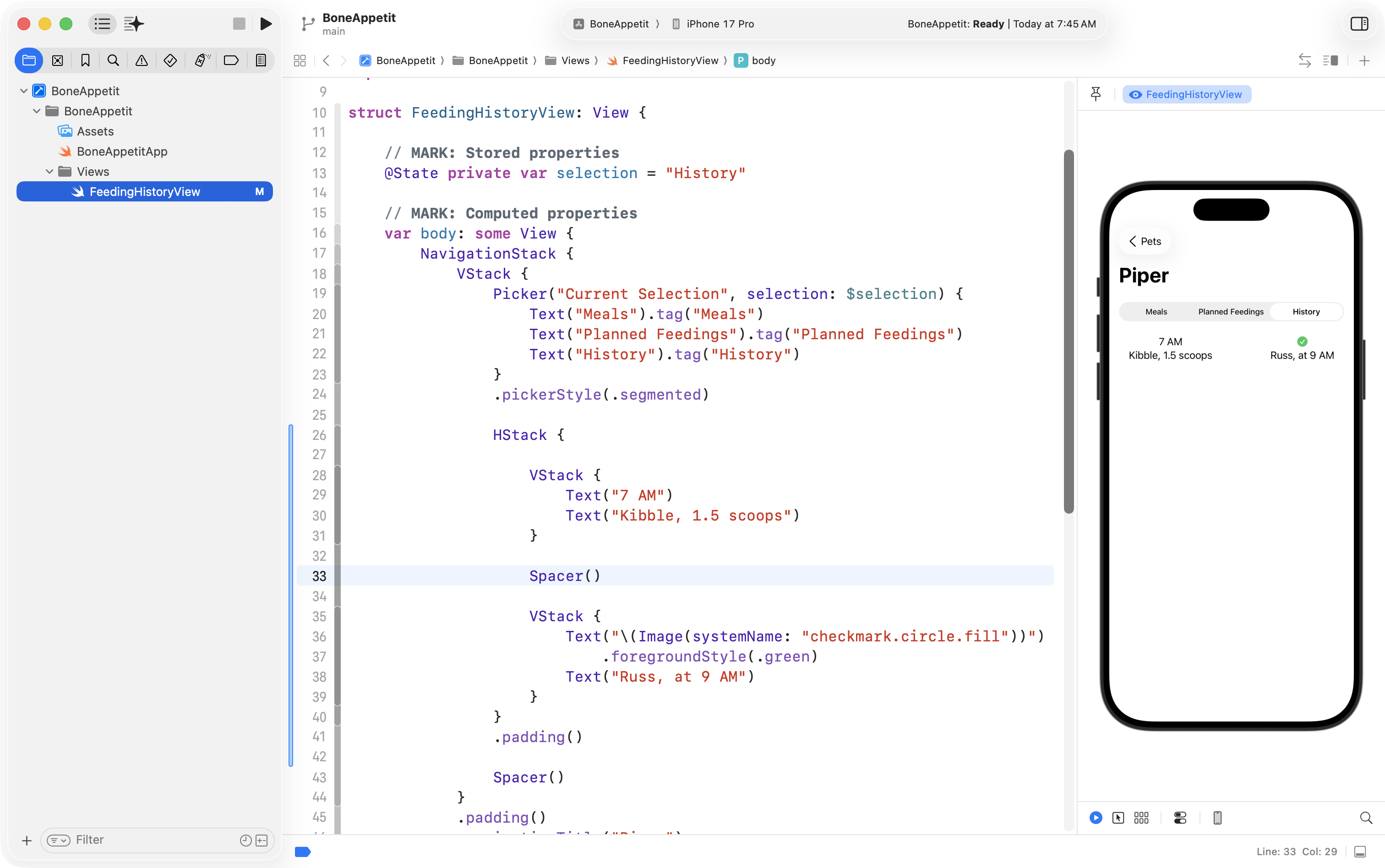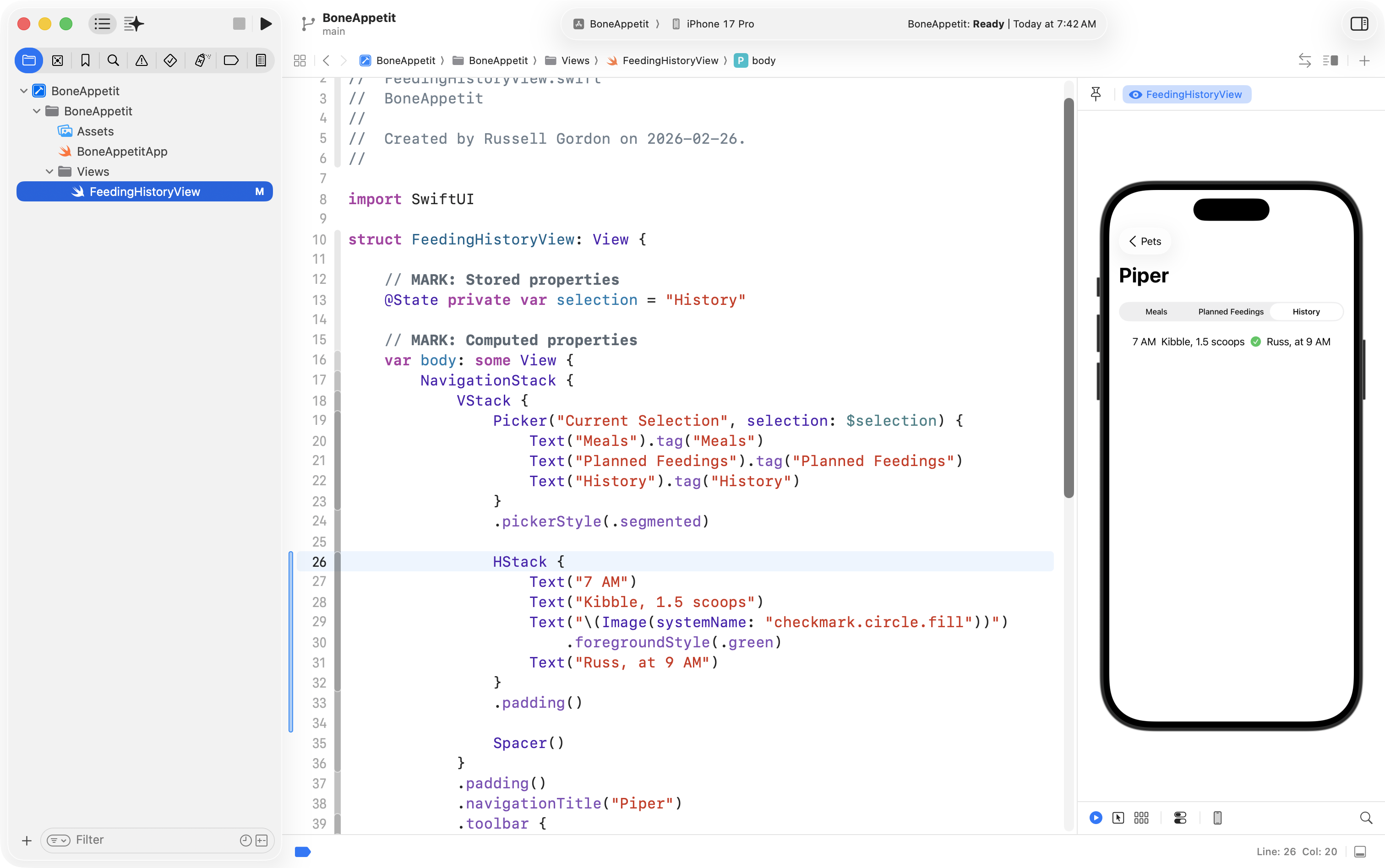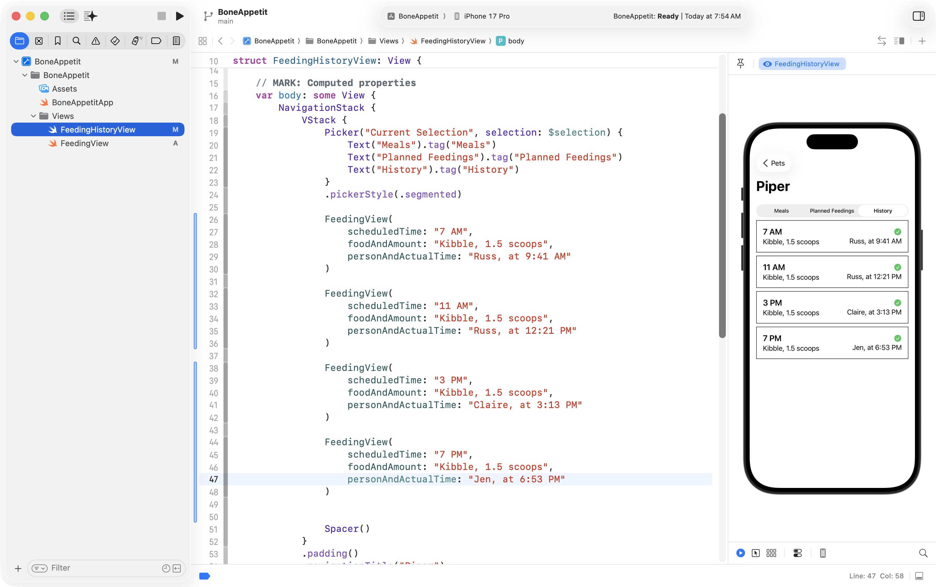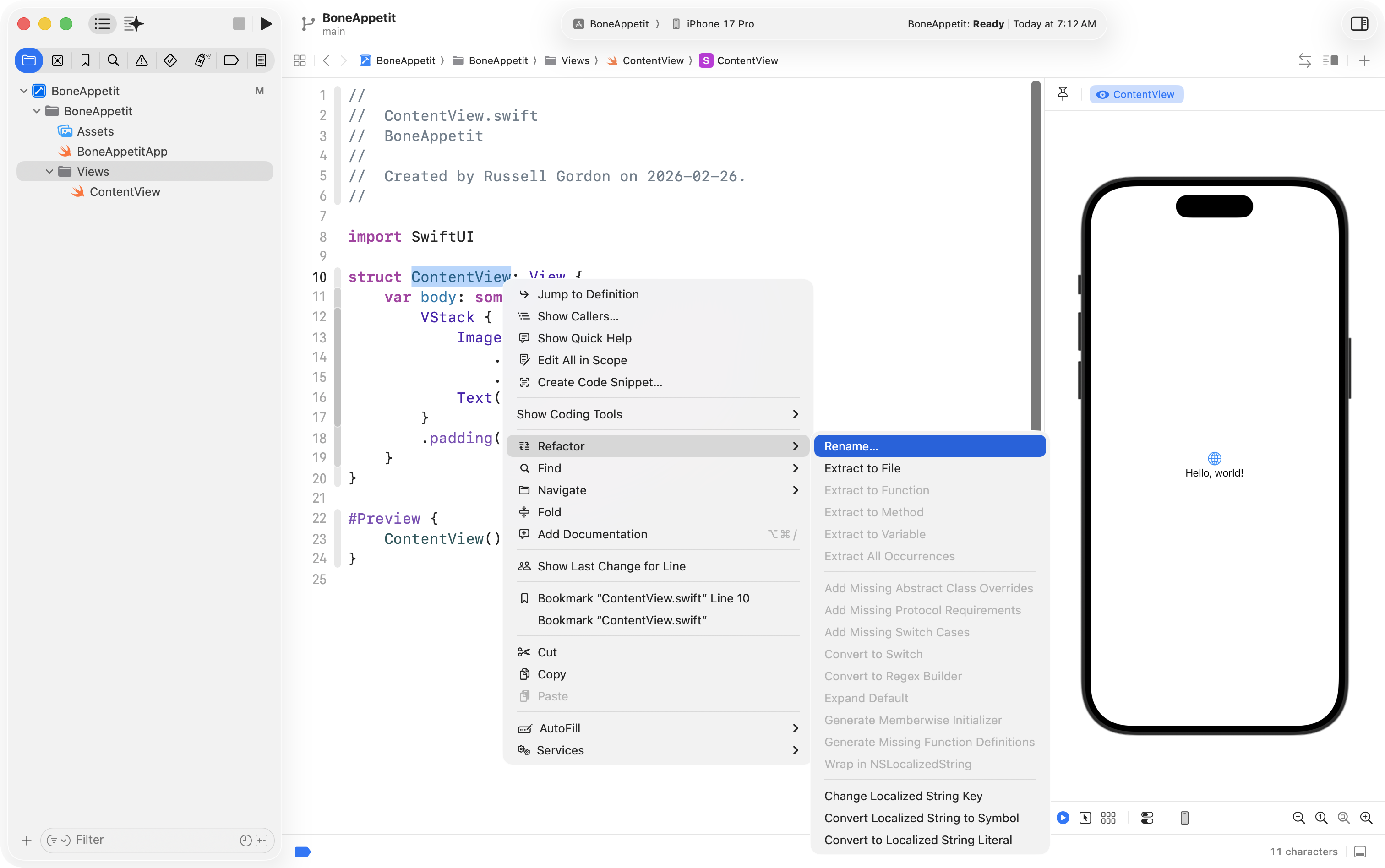 Finally, he used the Refactor > Rename feature to change ContentView into FeedingHistoryView so that the interface he will create is in a structure with a more descriptive name: