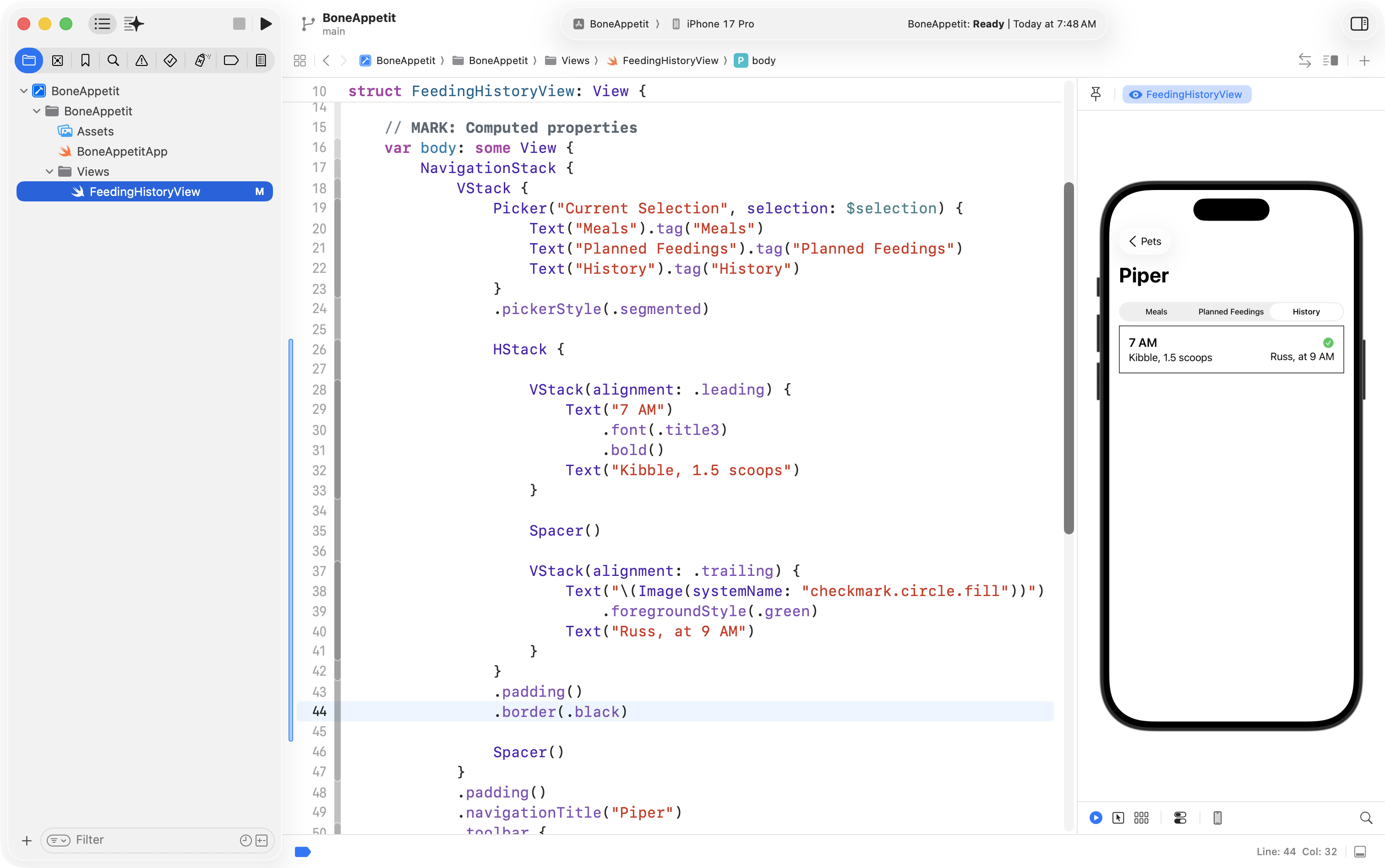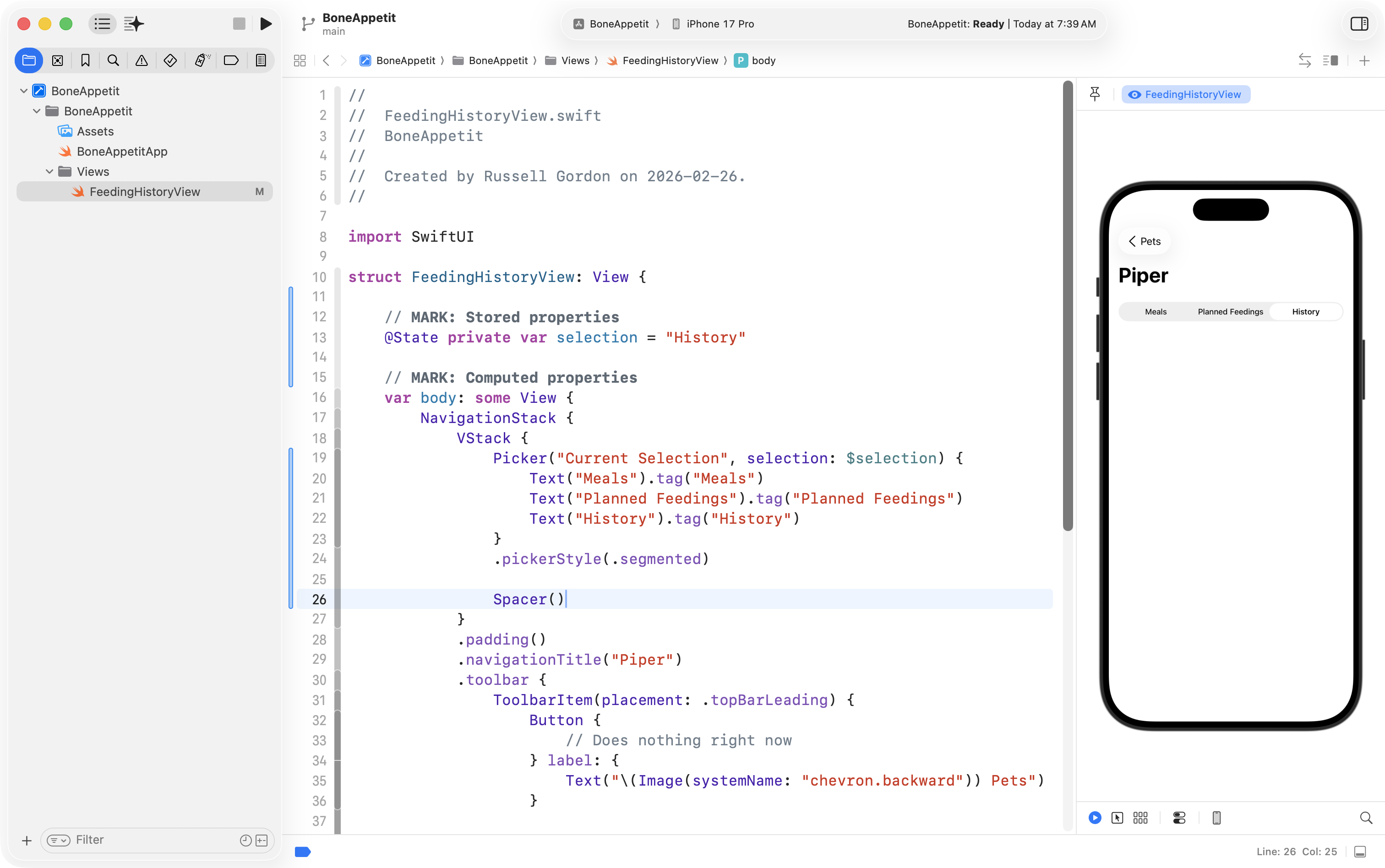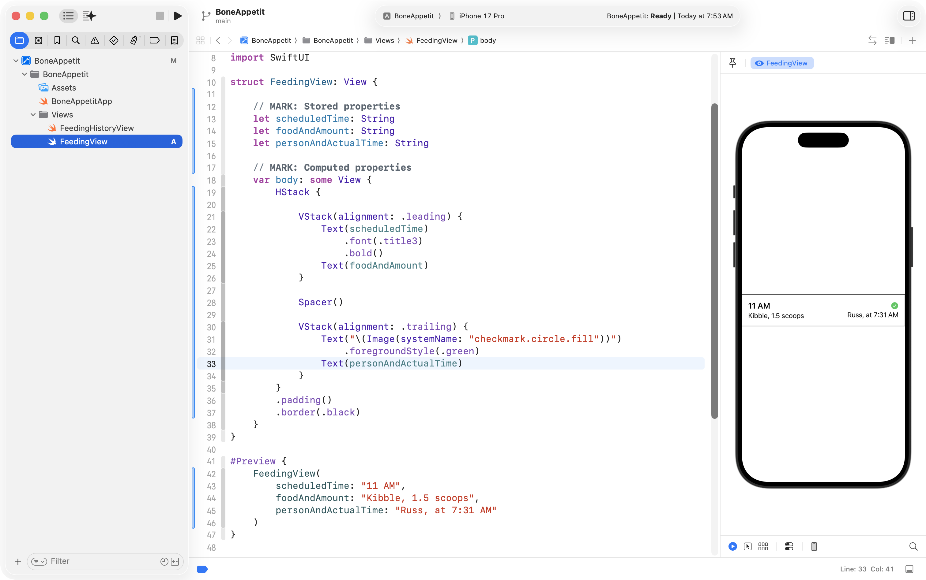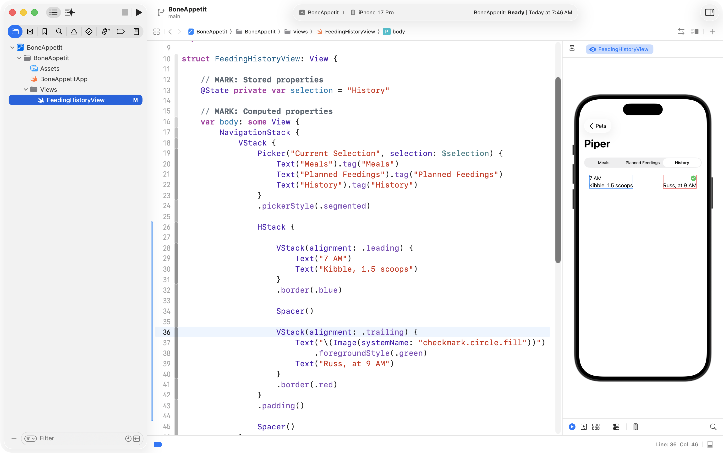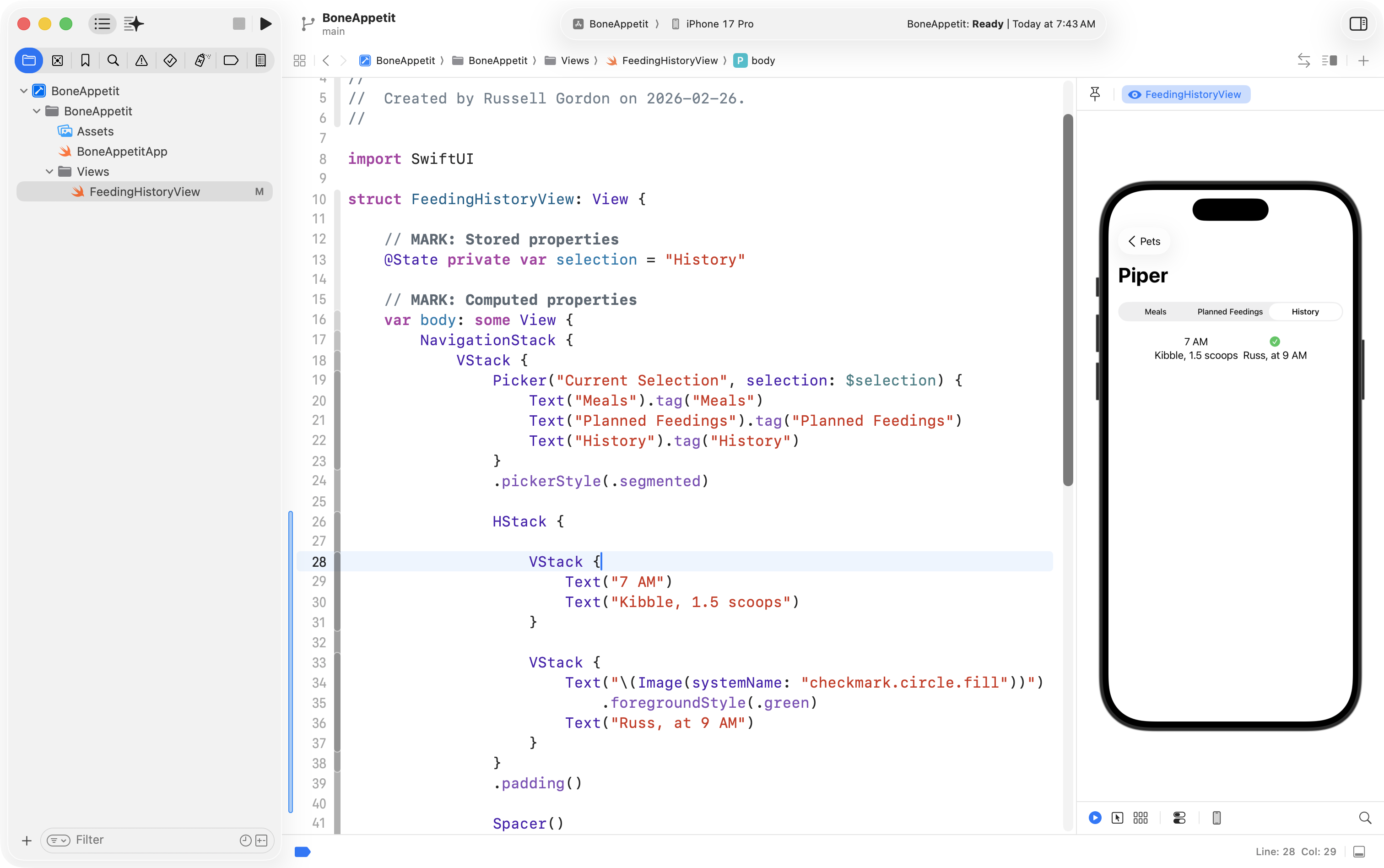 Finally, he used the Refactor > Rename feature to change ContentView into FeedingHistoryView so that the interface he will create is in a structure with a more descriptive name: