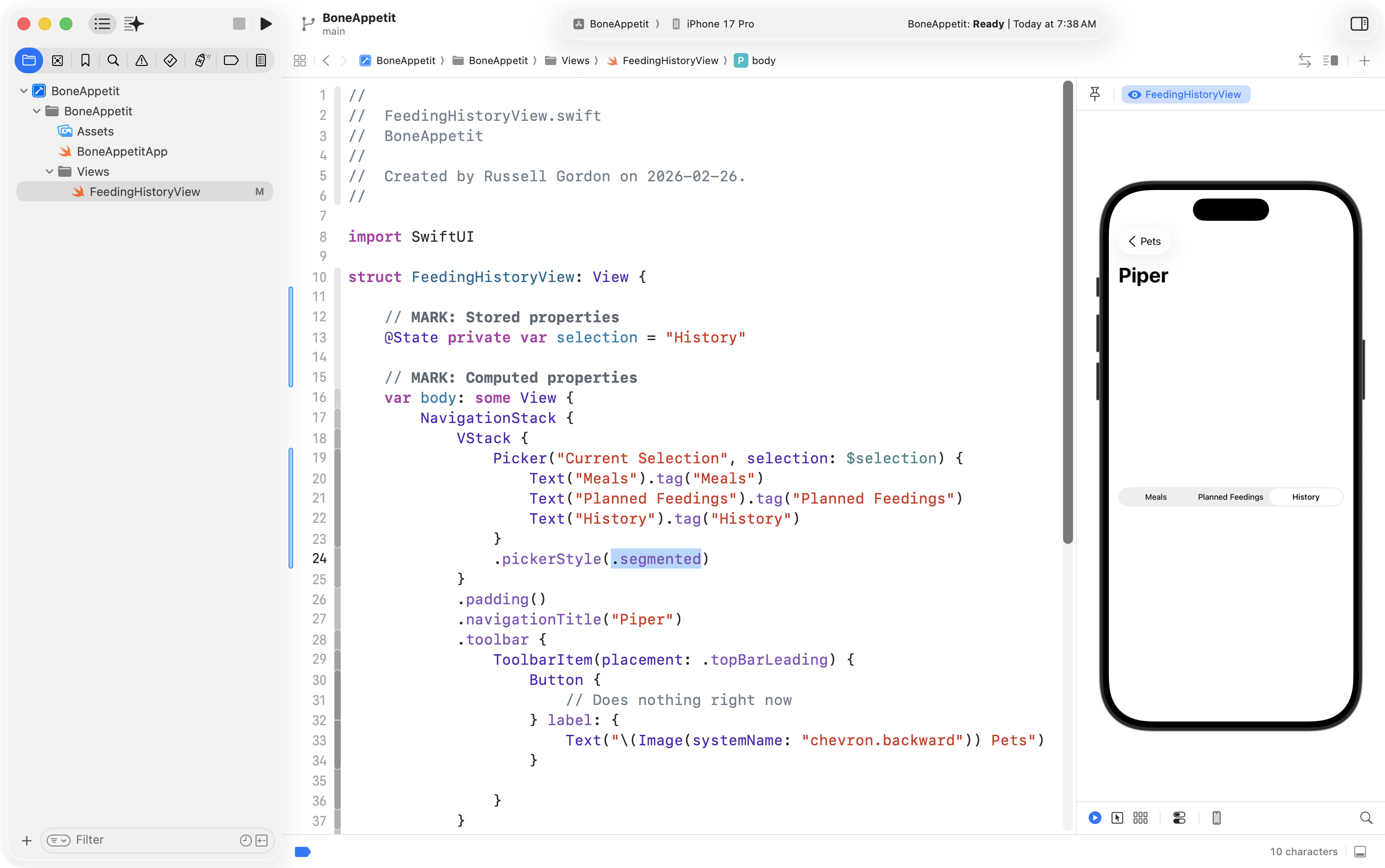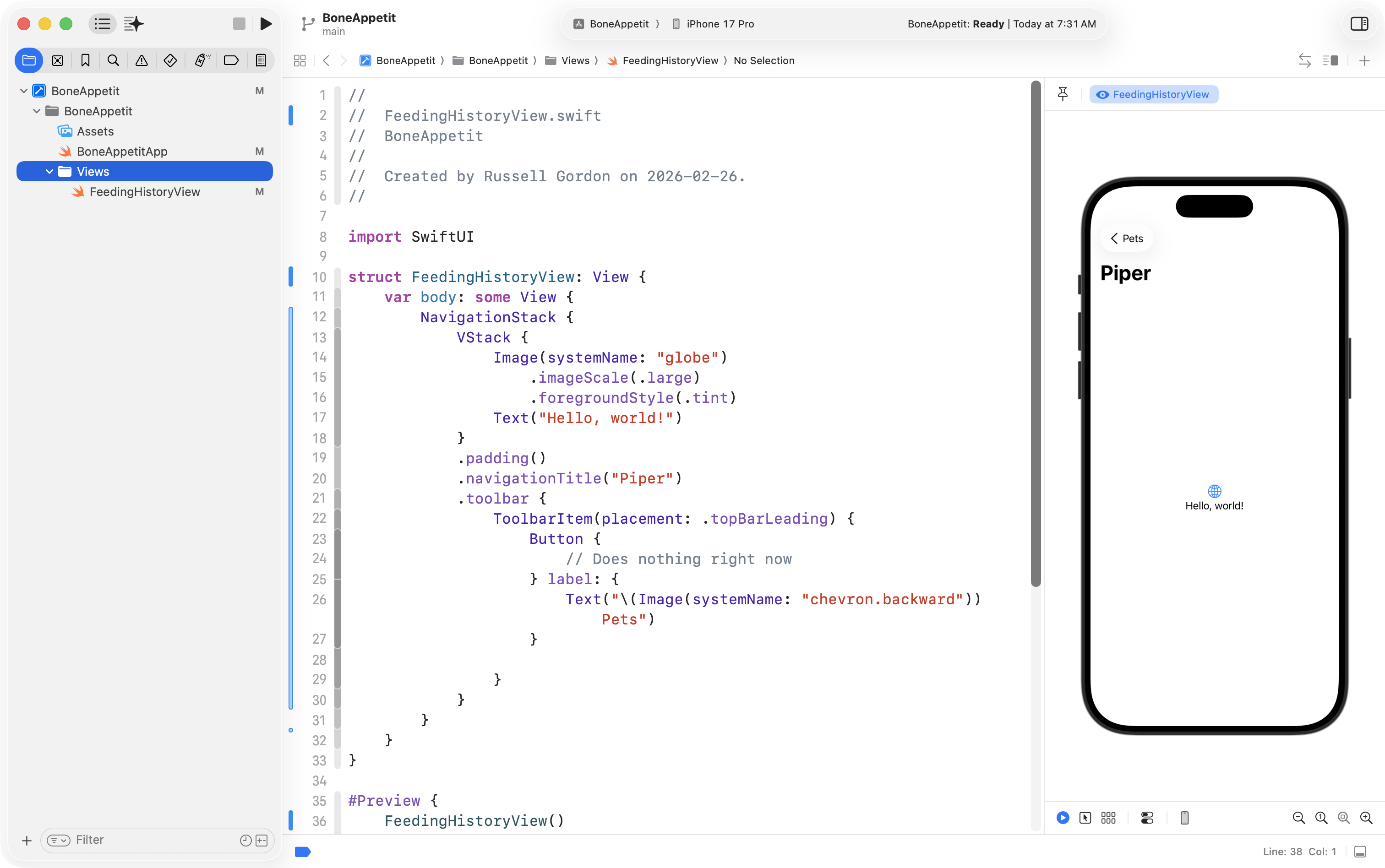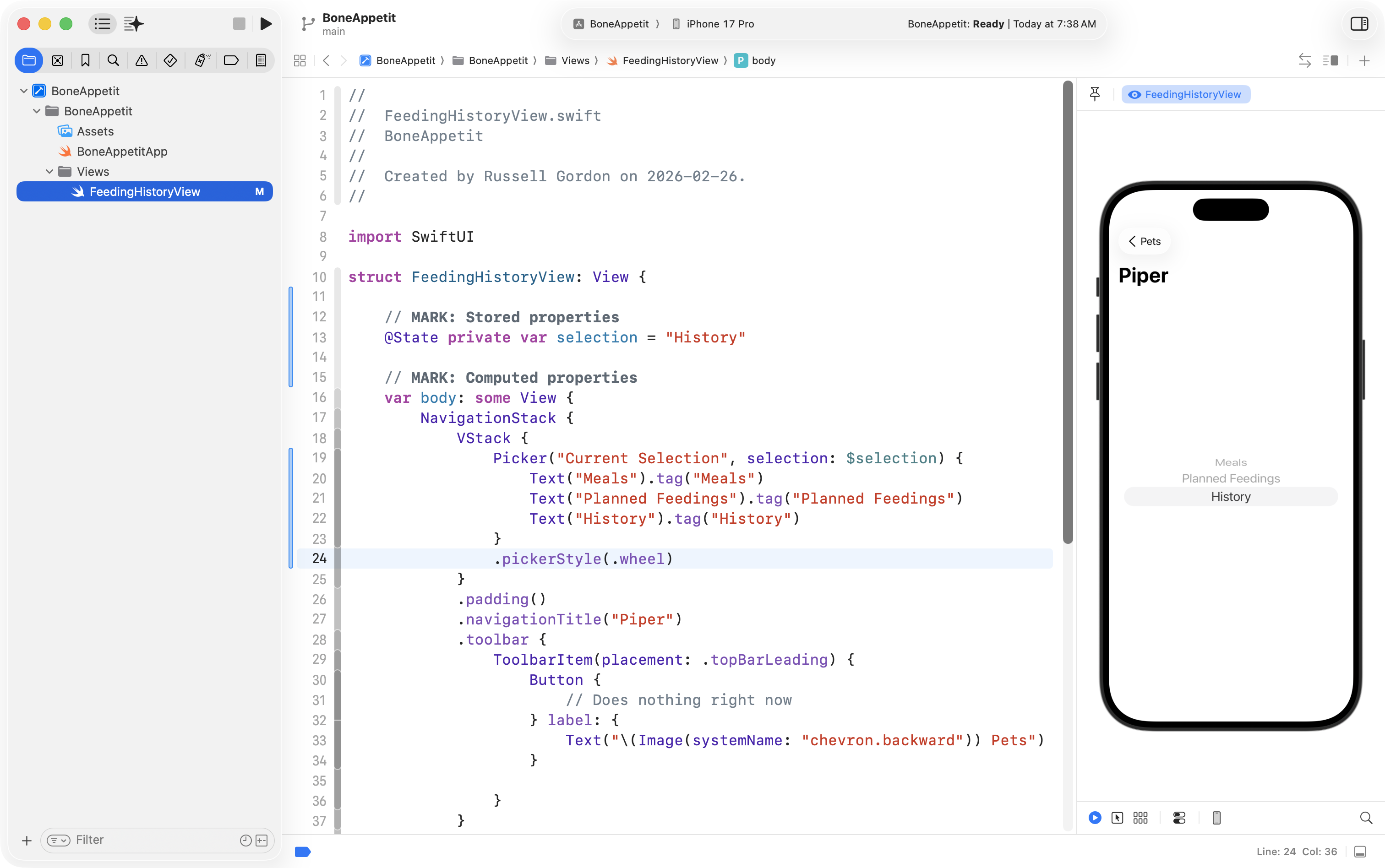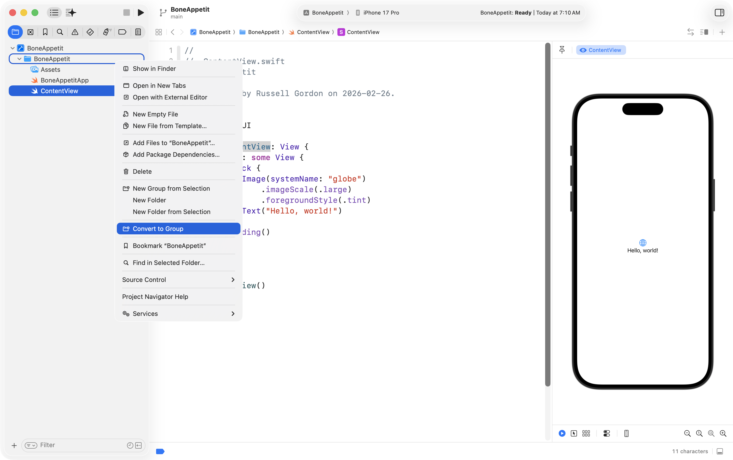 Finally, he used the Refactor > Rename feature to change ContentView into FeedingHistoryView so that the interface he will create is in a structure with a more descriptive name: