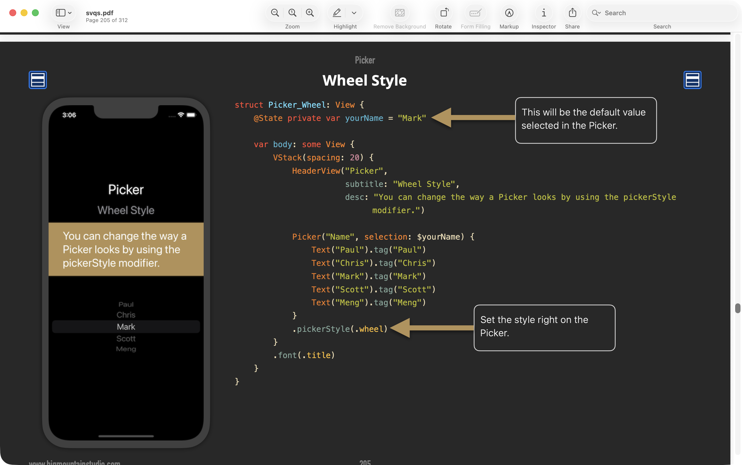 Mr. Gordon used SwiftUI Views Quick Start to look up the Picker control which allows for selections between different states: