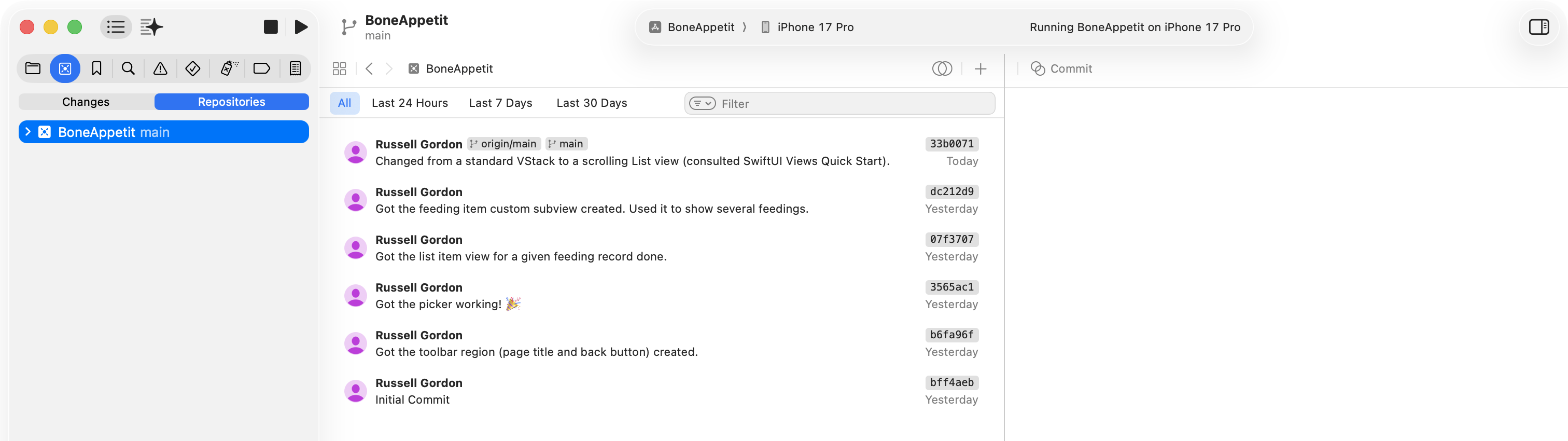 Effective of use of source control is shown through regular commits made with descriptive messages: